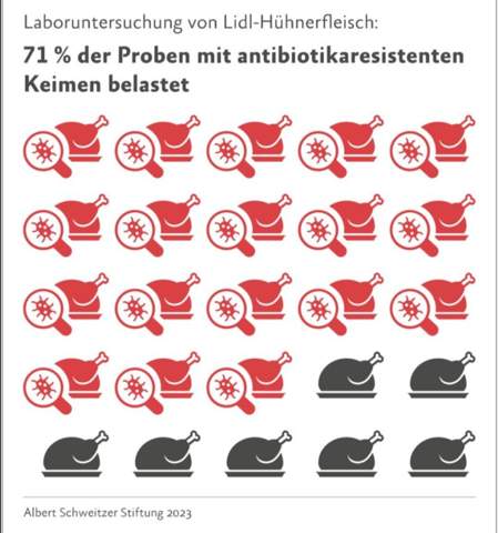 Die Belastung von multiresistenten Keimen im Fleisch ist übrigens nicht Theorie, wie eine Untersuchung bei Lidl ergeben hat: